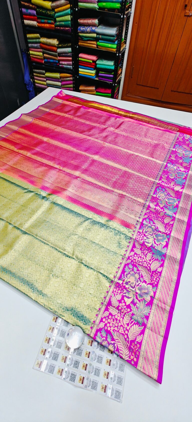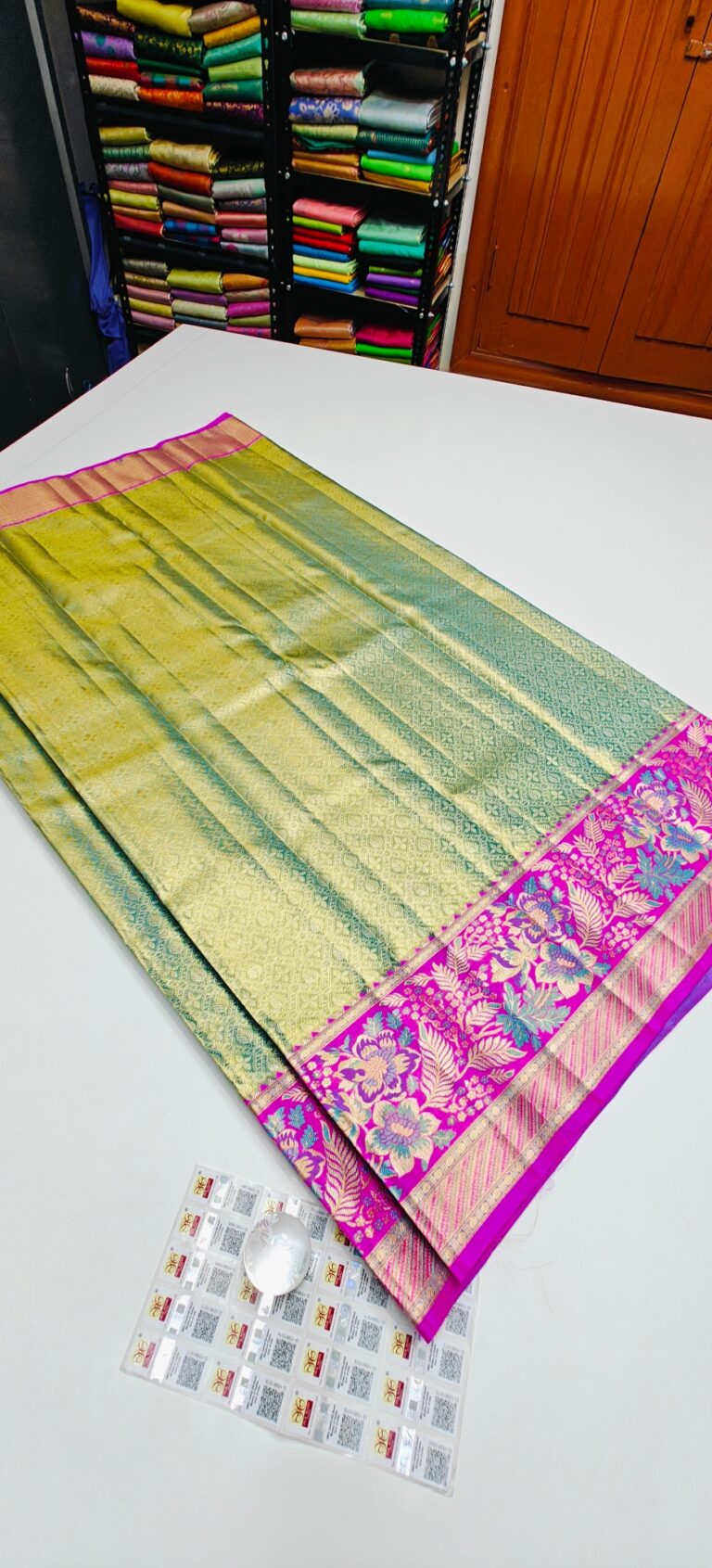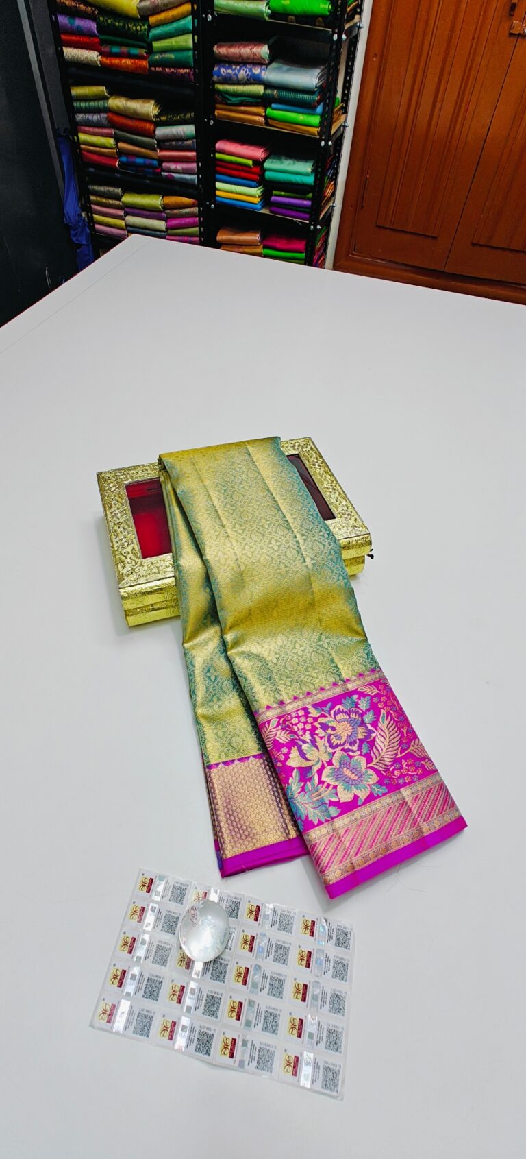 Storage: Store silk sarees folded neatly in a breathable cotton or muslin cloth to prevent creasing and protect them from dust and pests.