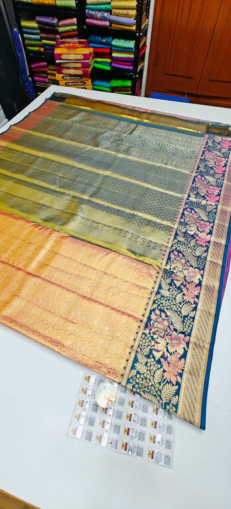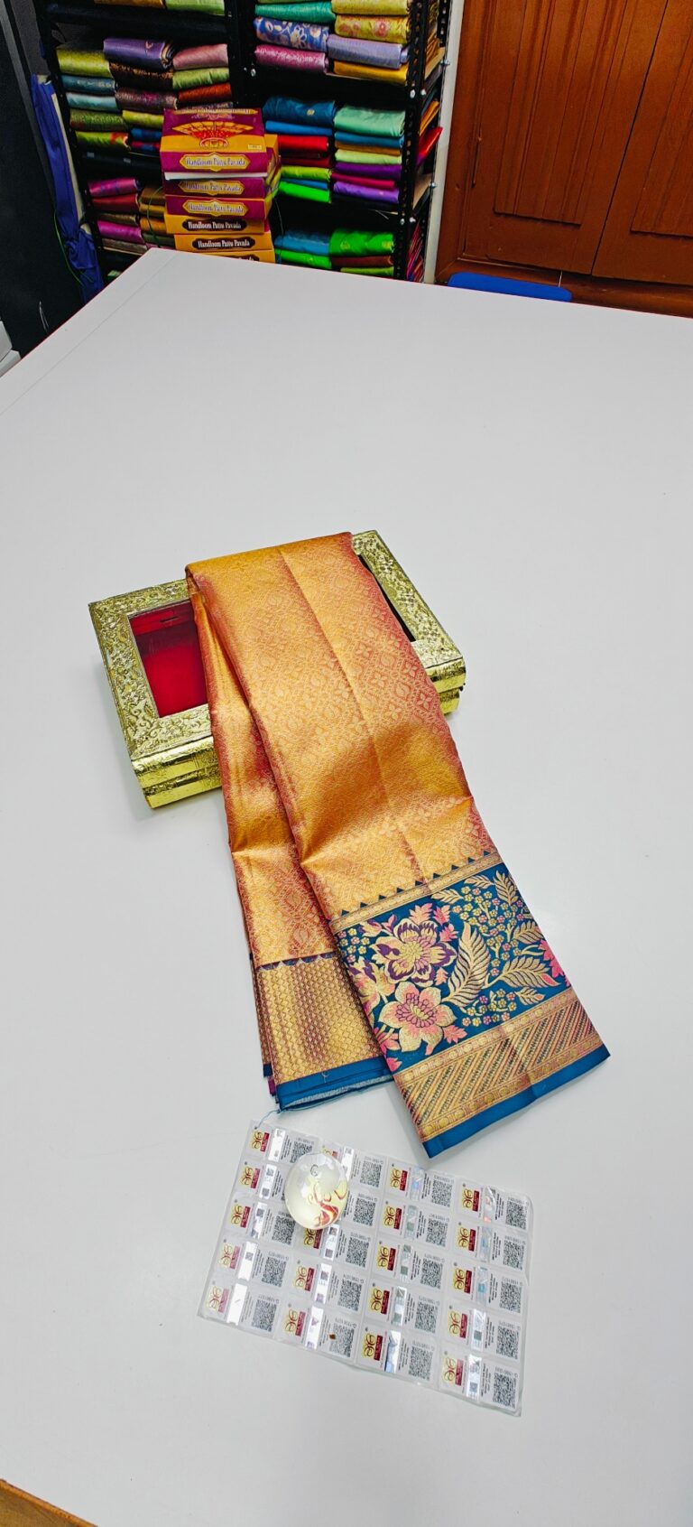 Storage: Store silk sarees folded neatly in a breathable cotton or muslin cloth to prevent creasing and protect them from dust and pests.