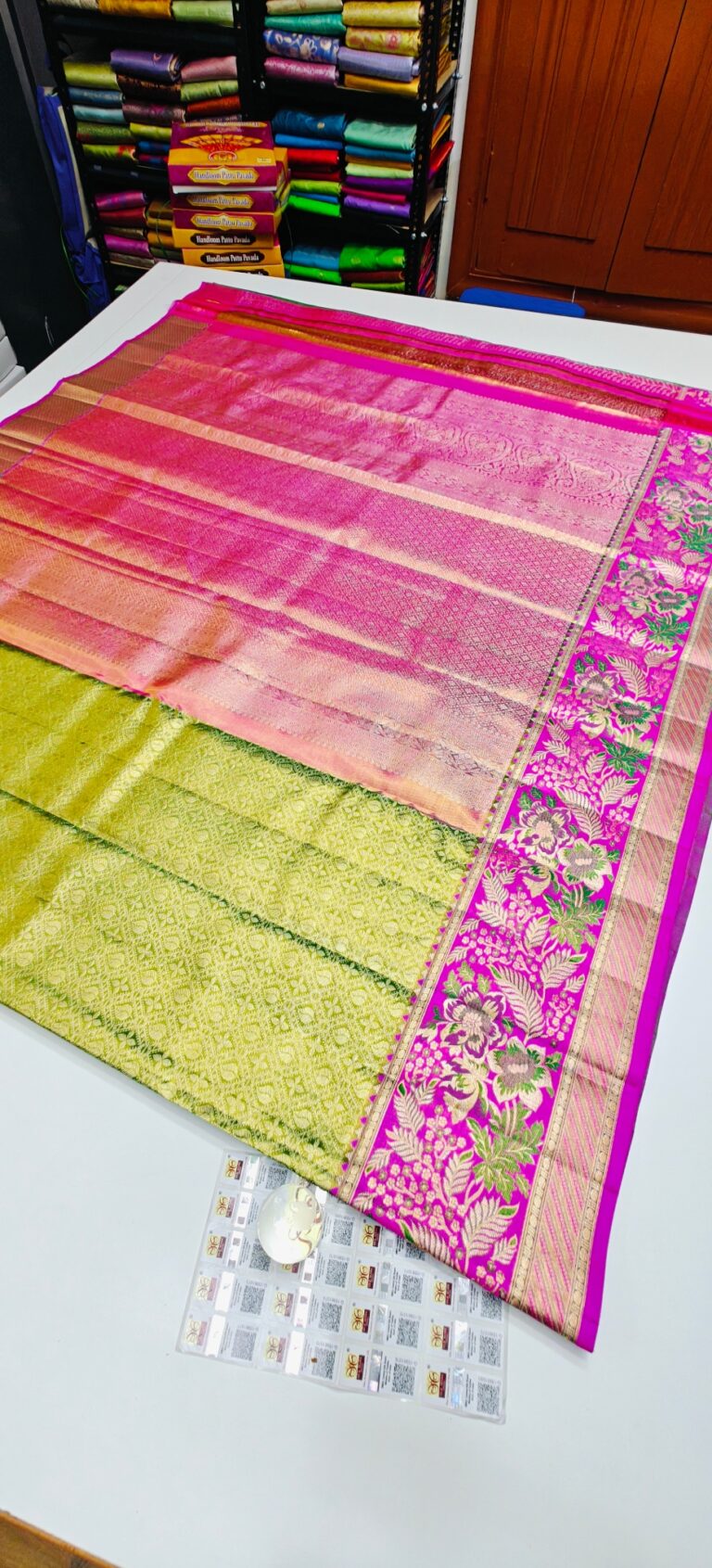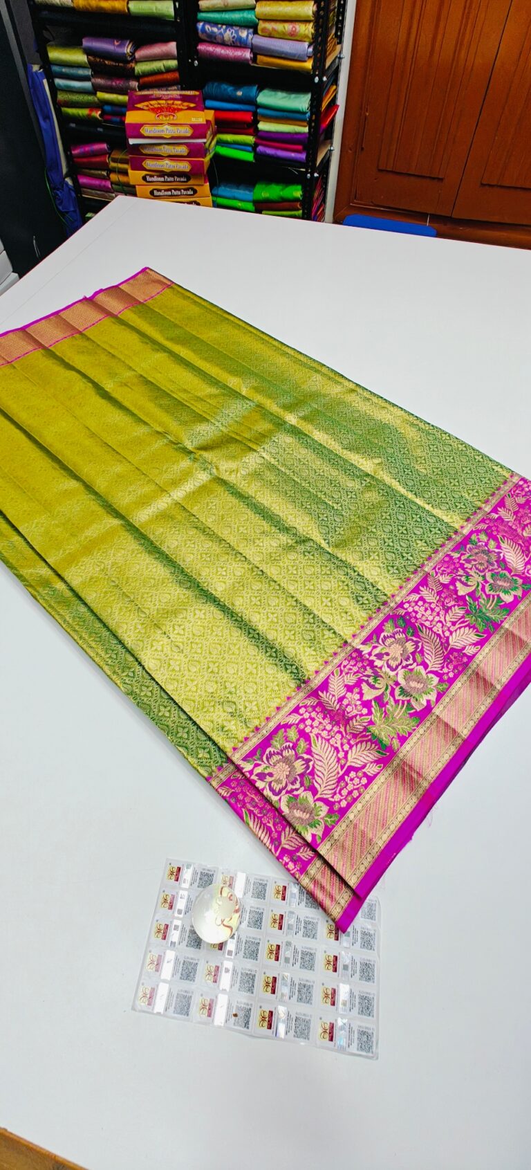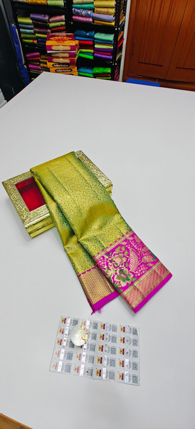 Storage: Store silk sarees folded neatly in a breathable cotton or muslin cloth to prevent creasing and protect them from dust and pests.